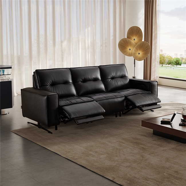 此外,黑马沙发以包豪斯几何美学为设计核心,坚持“功能为王、少即是多”,线条利落、结构稳固、无冗余装饰,将意式皮革奢感与现代简约完美融合。黑色主调自带经典、力量与高级感,结构如马身般沉稳扎实,形成兼具张力与内敛的美学风格,完美适配100㎡以上中大户型,可轻松融入现代、极简、意式、轻奢等多种装修风格。对于追求空间高级感、拒绝繁杂设计的都市精英而言,这款沙发既是功能中心,也是视觉焦点,足以平衡个人审美与家庭生活。