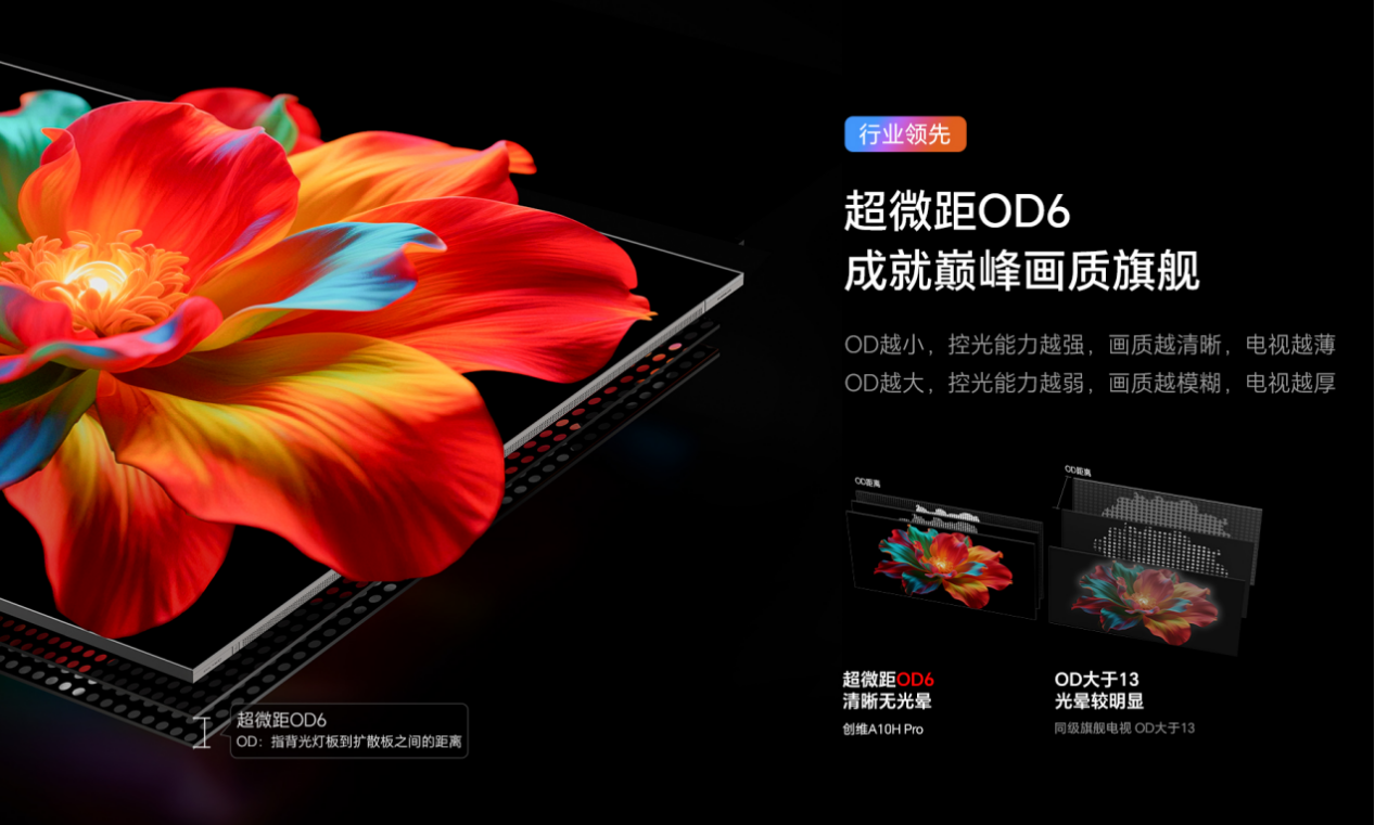 此外,超微距OD 6技术缩短了背光到屏幕之间的混光距离,能够精准聚拢背光光线,提升亮度的同时,还能削弱人物和物体周围的光晕,使边缘更加立体分明。