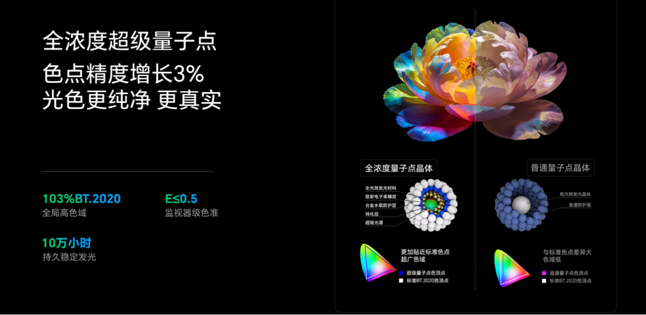 而在色彩方面,创维A10H Pro升级采用了SQD-Pro第二代超级量子点技术,实现了全局更高色域覆盖,支持同级产品中最高的103%BT.2020色域覆盖,鲜活展现更多色彩。为了进一步提升色彩纯度,SQD-Pro技术还采用了创维独家「1nm真彩滤光层」,使色彩纯净度大幅提升了47%,显色更加纯正。